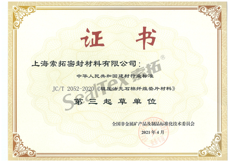 我司參與起草JC/T2052《輥壓法無石棉纖維墊片材料》標準 上海索拓密封材料有限公司(以下簡稱“我司”)參與起草了JC/T 2052-2020《輥壓法無石棉纖維墊片材料》標準 是JC/T 2052-2020《輥壓法無石棉纖維墊片材料》標準的第三起草單位。 上一個 返回列表 下一個