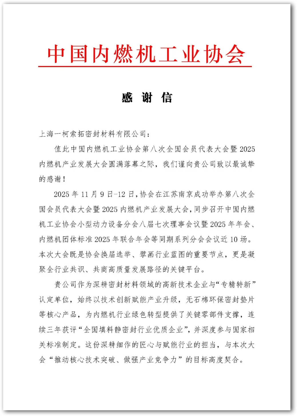 近日,我司收到來自中國內燃機工業協會的感謝信,也借此機會感謝協會的多年信任和支持,作為會員我們一直全力盡責盡職并很榮幸作為其中一員推動協會和行業的發展。并再次祝賀大會的成功召開。